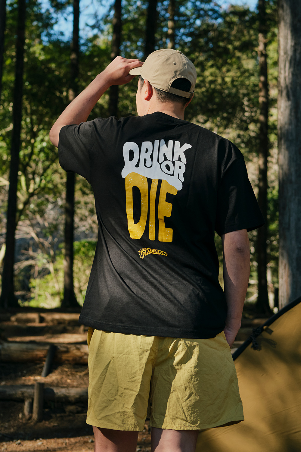 「DRINK OR DIE」とは、お酒を愛する者の覚悟。 背中に掲げたこのメッセージは、キャンプとお酒をこよなく愛するHILLS FIELDらしさを体現しています。